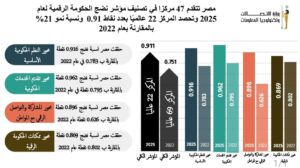 تقدمت مصر 47 مركزًا فى تصنيف مؤشر نضج الحكومة الرقمية لعام 2025 الصادر عن البنك الدولى، حيث عززت مكانتها ضمن مجموعة الدول الرائدة فى الحكومة الرقمية بالفئة (أ) وهى أعلى فئة فى المؤشر.