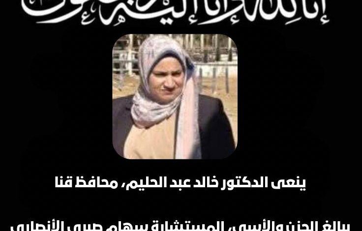 محافظ قنا ينعى وفاة مستشارة في حادث سير ويؤكد شهيدة الواجب الوطني