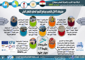 واشار المهندس محمد صلاح الدين عبد الغفار رئيس مجلس ادارة شركة مياه الشرب والصرف الصحي بسوهاج والعضو المنتدب انه فى مجال المشروعات تم الانتهاء من تنفيذ 100% من المتاح من مشروع الوصلات المنزلية لمياه الشرب ونسبة 100% من المتاح من الوصلات المنزلية للصرف الصحى لقرى المبادرة الرئاسية لتطوير الريف المصرى “حياة كريمة” وانه يتم استلام وتشغيل مشروعات مياه الشرب والصرف الصحى التى تنفذها الهيئة الهندسة للقوات المسلحة والهيئة القومية لمياه الشرب والصرف الصحى لتصل نسبة التغطية لخدمات مياه الشرب الى 100% داخل الكتلة السكنية وتصل نسبة تغطية خدمات الصرف الصحى داخل الكتلة السكنية 75% عقب الانتهاء من المشروعات هذا بالاضافة الى الانتهاء من العديد من مشروعات الاحلال والتجديد والتى تشمل احلال وتجديد 31 محطة مياه شرب و 20 محطة صرف صحى بقيمة 158 مليون جنيه واستكمال 5 مشروعات ضمن خطط الاحلال والتجديد بقيمة 49 مليون جنيه واحلال وتجديد 7 كم شبكات مياه و 2 كم شبكات صرف صحى بقيمة 15 مليون جنيه ومد وتدعيم 174 كم شبكات مياه و 35 كم شبكات صرف صحى بقيمة 179 مليون جنيه وتاهيل 6 كم خط طرد محطة رقم 1 بقيمة 75 مليون جنيه وتوريد معدات واجهزة لعدد 14 مشروع وعدد 15 سيارة خدمات بقيمة 68 مليون جنيه وتشغيل محطة مياه توسعات طهطا ومحطة مياه المحزمين ومشروع صرف صحى السماكين واحلال وتجديد 65 كم شبكات مياه شرب وتوصيل المرافق لعدد 21 مدرسة وتركيب 360 بوش حريق بقيمة 285 مليون جنيه ضمن مشروعات برنامج التنمية المحلية بصعيد مصر وبدء اعمال مشروع صرف صحى اولاد عزاز ومنطقة المنياوى ومشروع تاهيل وتوسع محطة مياه غرب سوهاج الانجليزي بقيمة 675 مليون جنيه ضمن مشروعات برنامج تحسين خدمات مياه الشرب والصرف الصحى IWSP2.