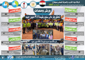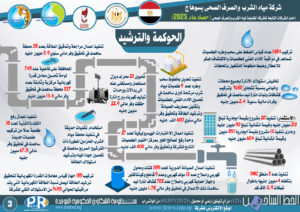وفى مجال الحوكمة والترشيد تم تنفيذ اعمال المحافظة على 745 لوحة تحسين معامل قدرة كهربائية مركزية وثابتة مركبة بعدد 337 محطة مياه شرب وصرف صحي ساهمت في تحقيق وفر مالي بقيمة 13.6 مليون جنيه وتنفيذ اعمال رفع الكفاءة الفنية لعدد 15 طلمبة رفع مياه شرب وصرف صحي بدلاً من تركيب طلمبات جديدة ساهمت في تحقيق وفر مالي بقيمة 67.5 مليون جنيه تنفيذ تعديل بخطوط سحب وطرد عدد 9 طلمبات مياه شرب مرشحة كبرى ساهمت في تحسين الاداء الفني للطلمبات وتقليل مصاريف الصيانة وترشيد الطاقة وتحقيق وفر مالي سنوي بقيمة 400 الف جنيه وتنفيذ اعمال مراجعة وتدقيق الطاقة بعدد 38 محطة مياه شرب وصرف صحي ساهمت في ترشيد الطاقة وتحقيق وفر مالي سنوي 3.9 مليون جنيه وتنفيذ اعمال الاختبارات الهيدروليكية لعدد 27 وحدة رفع مياه شرب وصرف صحي لصالح الغير بمركز اختبار الطلمبات التابع للشركة وتحقيق وفر مالي 400 الف جنيه وتنفيذ اعمال الصيانة الدورية لعدد 385 كشك ومحول كهربي واصلاح عدد 13 مولد كهربي وعدد 9 قاطع وكونتاكتور وجهاز حماية كهربي واصلاح عدد 207 كشاف انارة ليد ساهمت تلك الاعمال في تحقيق وفر مالي 1.78 مليون جنيه وتخفيض استهلاك الانارة بجميع محطات والمباني بنسبة تتجاوز 50% وضبط درجة حرارة التكييفات وتركيب كشافات ولمبات انارة ليد موفرة للطاقة ساهمت في تحقيق وفرات مالية سنوية 2.4 مليون جنيه وتركيب 185 جهاز قياس معاملات القدرة الكهربائية باور ميتر لاستكمال منظومة مراقبة استهلاك الطاقة وضبط منظومة التشغيل لتحقيق ترشيد الطاقة بمحطات الشركة ليصل نسبة الطاقة الكهربائية التي يتم مراقبتها 95% من الاستهلاك الكلي للشركة وتركيب عدد 1484 عداد قياس الضغط على سحب وطرد طلمبات مياه الشرب والصرف الصحي تساهم في مراقبة الاداء الفني للطلبات والاكتشاف المبكر للاعطال وضبط منظومة التشغيل بالمحطات واستخدام تقنيات حديثة في تنفيذ محطة مياه الشرب المحزمين المطورة ذات الترشيح السريع ساهمت في تحسين جودة المياه المنتجة وترشيد استهلاك الطاقة وتحويل عدد 20 محرك ديزل مستعمل ومستغنى عنه الى بدالات ووحدات توليد كهرباء ببرج انارة حققت وفر مالي 22.9 مليون جنيه وكذلك تنفيذ 3 مناطق DMZ بتكلفة 4 مليون جنيه باطوال شبكات 2.9 الف كيلو متر وكذلك تنفيذ 20 مشروع استثمارى بنظام حق الانتفاع بقيمة ايجارية تبلغ 213 مليون جنيه وقيمة انشائية تبلغ 90 مليون جنيه وجارى تنفيذ 13 مشروع بقيمة ايجارية 851 مليون وقيمة انشائية تبلغ 604 مليون جنيه.