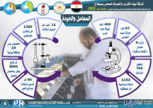 وفى مجال المعامل وجودة مياه الشرب تم رفع وتحليل 400 الف عينة مياه شرب وغسيل شبكات باطوال 11 الف كيلو متر وانشاء 8 معمل كنقاط مراقبة لمتابعة المحطات الصغري وتحليل 67 الف عينة من السيب النهائى لمياه الصرف الصحى المعالج والرقابة على 1162 منشاة صناعية جديدة ليصبح اجمالى المنشات الصناعية التى يتم مراقبتها 8980 منشأة صناعية والحصول على 19 موافقة بيئية للمشروعات ليصبح اجمالى الموافقات البيئية بالشركة 398 موافقة وفتح 8500 محابس وبوش غسيل والرد على 1289 شكاوى وغسيل شبكات للغير باطوال 66 كيلو متر وتطهير 700 خزان مياه شرب.