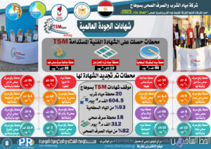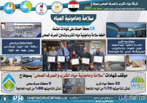 وفى مجال شهادات الجودة العالمية حصلت 3 محطات مياه شرب وصرف صحى على الشهادة الدولية فى التنمية الفنية المستدامة TSM كما تم تجديد الشهادة لعدد 16 محطات وتجديد شهادة الايزو 17025 لعدد 15 معمل مياه شرب وصرف صحى وتجديد شهادة الايزو 9001 لعدد 6 إدارات وقطاعات عامة وتجديد شهادة الايزو 21001 للادارة العامة للتدريب كما حصلت محطة مياه المراغة جهينة السطحية على شهادة الايزو 50001 في نظام ادارة الطاقة وحصلت 15 محطة مياه شرب وصرف صحى على شهادة اعتماد سلامة ومامونية مياه الشرب وتداول الصرف الصحى.