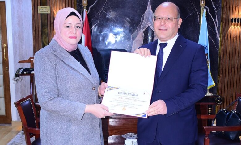 رئيس جامعة سوهاج يكرم المهندسه نهال المغربي لحصولها على المركز الرابع علي مستوي الجهاز الإداري بجائزة مصر للتميز الحكومي