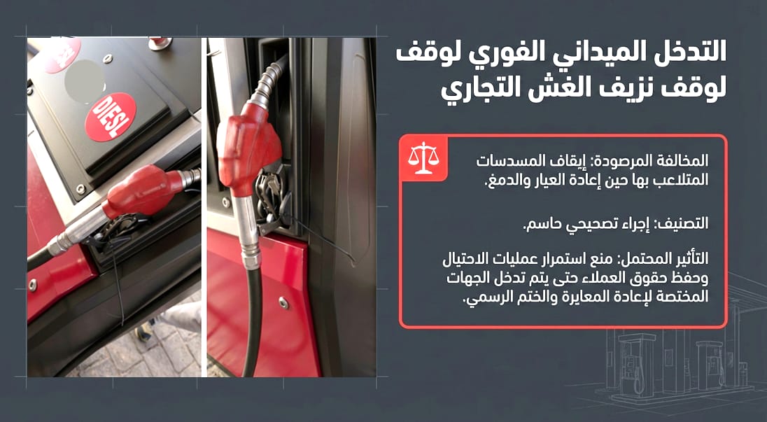 كما تم فحص شكوى متداولة على مواقع التواصل الاجتماعي بشأن إحدى محطات الوقود بمحافظة القليوبية، حيث تبين وجود تلاعب في معايرة طلمبات السولار، ما أدى إلى نقص الكميات المنصرفة للمواطنين لصالح المحطة. كما تم الكشف عن وجود مياه بصهاريج المنتجات، وتم إلزام الوكيل بتطهير الصهاريج، وإيقاف الطلمبات المخالفة لحين إعادة دمغها بواسطة مصلحة الدمغ والموازين.