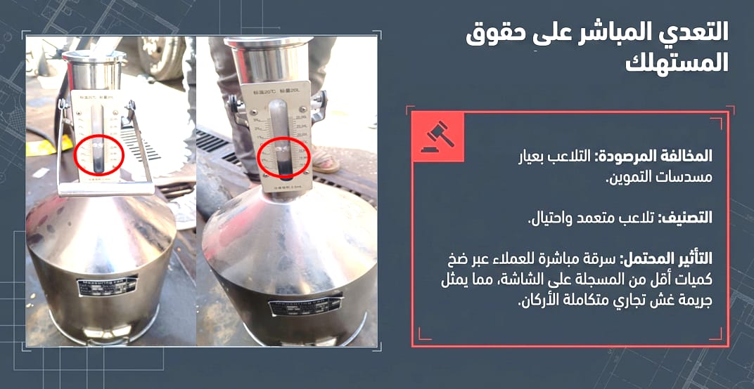 وكشفت الحملات كذلك عن قيام إحدى محطات القليوبية بتعطيل أجهزة القياس الآلي للخزانات، بهدف إخفاء حركة الوارد والمنصرف الفعلية، وجارٍ تطبيق اللائحة على الوكيل بخصم عمولة البيع طوال فترة التعطيل العمدي.