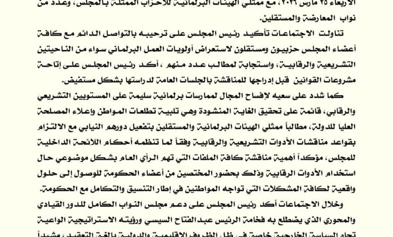كما شدد على أهمية تفعيل دور ممثلي الهيئات البرلمانية والمستقلين، والالتزام بالقواعد المنظمة لمناقشات الأدوات الرقابية، وفقًا لأحكام اللائحة الداخلية للمجلس، مع التأكيد على مناقشة كافة القضايا التي تهم الرأي العام بشكل موضوعي، وبمشاركة المختصين من أعضاء الحكومة للوصول إلى حلول واقعية للمشكلات.