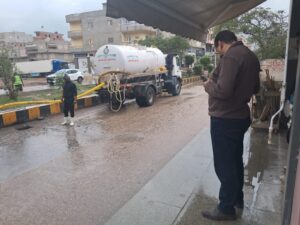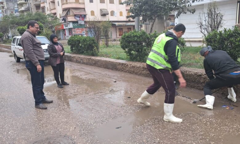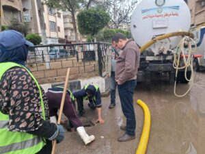 الدفع بسيارات ومعدات شفط المياه للتعامل الفوري مع تجمعات مياهالأمطار داخل المدينة والوحدات المحلية.
