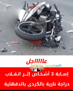 أُصيب ثلاثة أشخاص بإصابات متفرقة، إثر انقلاب دراجة نارية أمام نقطة إسعاف مدينة الكردي التابعة لمركز منية النصر بمحافظة الدقهلية، وتم نقلهم إلى المستشفى لتلقي الإسعافات والعلاج اللازم.