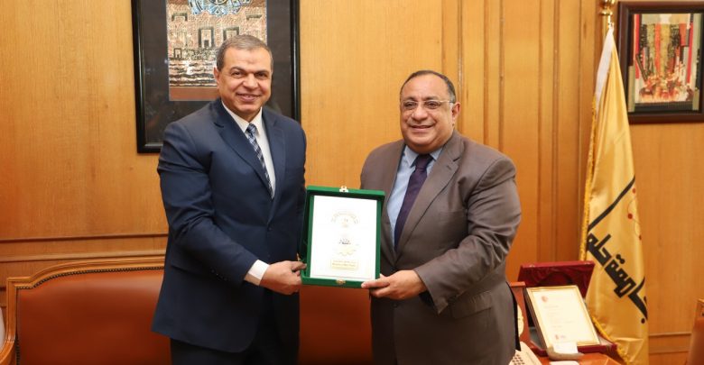 وزير القوي العاملة ورئيس جامعة حلوان يتبادلان الدروع