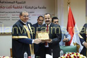 تبادل وزير القوى العاملة محمد سعفان ، والدكتور ماجد نجم رئيس جامعة حلوان الدروع على هامش حضور الوزير مناقشة رسالة دكتوراه ، للباحثة فاطمة ثابت جاد الكريم حسانين من العاملين بالوزارة .