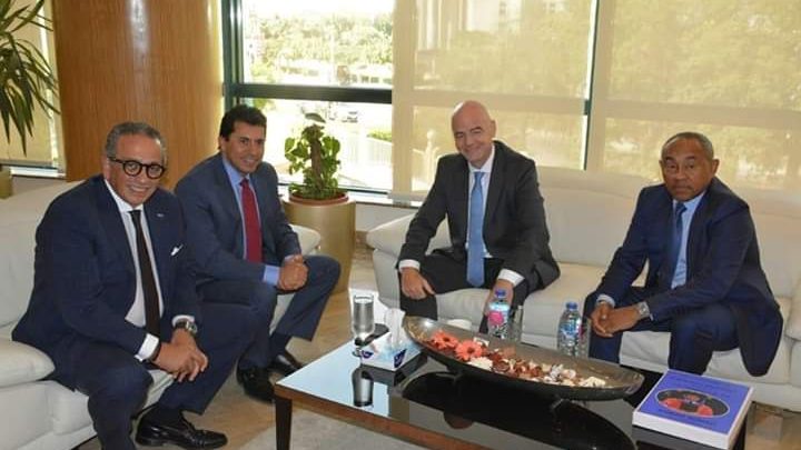 بحضورالدكتور أشرف صبحي وزير الشباب والرياضة استقبل اليوم جياني إنفانتينو رئيس الاتحاد الدولي لكرة القدم عمرو الجنايني رئيس اللجنة المكلفة بإدارة الاتحاد المصري لكرة القدم على هامش زيارته الحالية للاتحاد الأفريقي لكرة القدم بالقاهرة