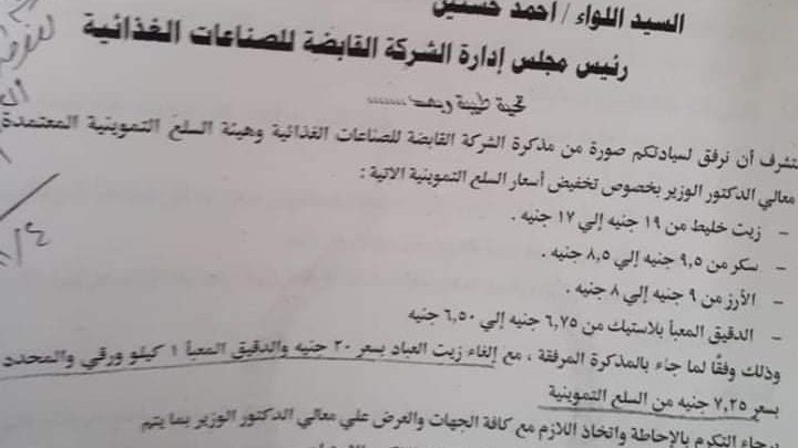وبحسب الخطاب الموجه من هيئة السلع التموينية، بوزارة التموين والتجارة الداخلية إلى قطاع الرقابة والتوزيع بالوزارة على صوره منه بأن الشركة القابضة للصناعات الغذائية، إفادت بتخفيض أسعار السلع التموينية، بعد اعتمادها من الوزير، ﻭأنه تم مخاطبة قطاع الرقابة والتوزيع لاتخاذ اللازم.