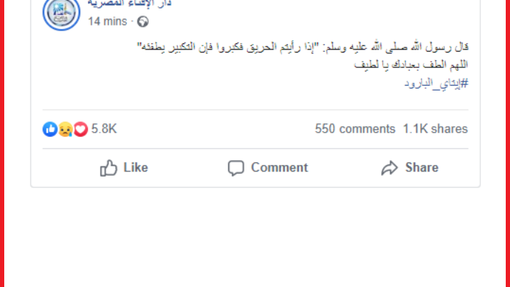 نشرت دار الإفتاء المصرية، تدوينه على صفحتها الرسمية على موقع التواصل الاجتماعى "فيس بوك"، جاء فيها "إذا رأيتم الحريق فكبروا فإن التكبير يطفئه"، متابعه:" اللهم الطف بعبادك يا لطيف"، وذلك تفاعلا مع حرق خط أنابيب للبترول بإيتاى البارود