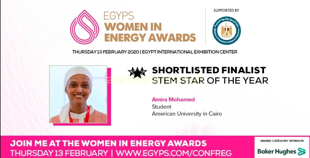 أميرة محمد..تعمل بهيئة البترول، بادارة العمليات وأحد الكوادر الشابة بالقطاع وهي واحدة من المرشحين للحصول على جايزه STEM star of the year ، وهى جائزة تمنح للباحثين فى مجال البترول والطاقة في (ايجيبس ٢٠٢٠)