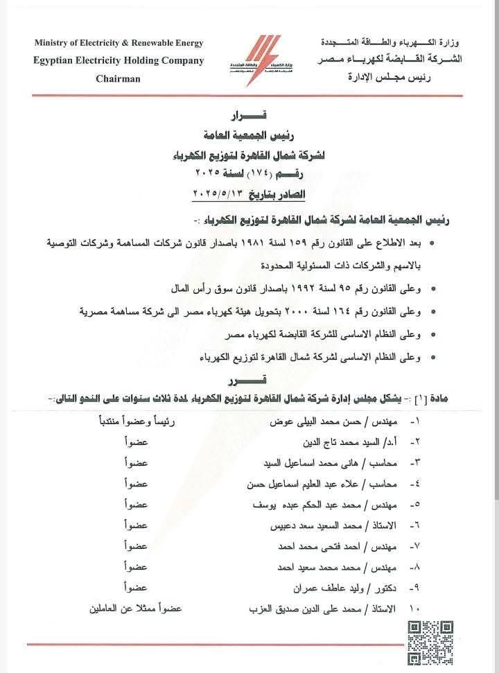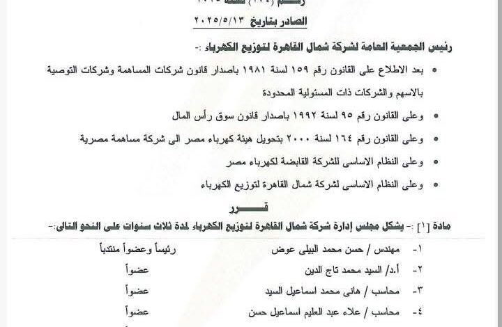 قرارا بتشكيل مجلس إدارة شركة توزيع الكهرباء شمال القاهرة وتتضمن