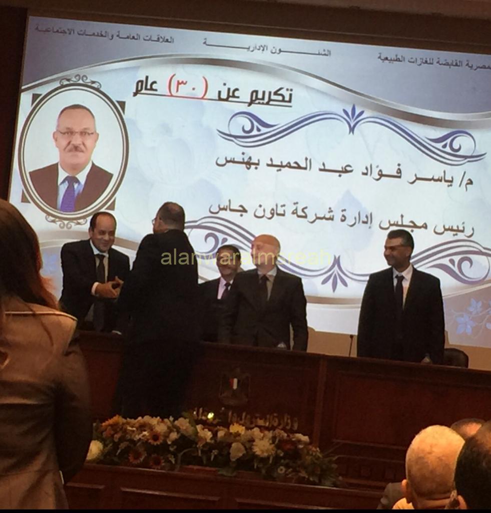كرم السيد المهندس أسامة البقلي رئيس الشركة المصرية القابضة للغازات الطبيعية “إيجاس”، السيد المهندس ياسر بهنس رئيس مجلس الإدارة والعضو المنتدب للشركة المصرية لتوزيع الغاز الطبيعي للمدن –تاون جاس – لمرور 30 عامًا على عملة بقطاع البترول. وجاء هذا التكريم في إطار الاحتفال السنوي الذي تقيمه شركة “إيجاس” لتكريم العاملين من ابنائها الذي امضوا من 5 إلى 35 عامًا ، وكذلك العامل المثالي و المتفوقين رياضيًا، وذلك بحضور الدكتور مجدي جلال نائب رئيس الشركة للعمليات ، والسيد أحمد جودة نائب رئيس الشركة للشئون الإدارية، ومحمد صديق رئيس اللجنة النقابية وعدد من النواب ومساعدي رؤساء الشركات.