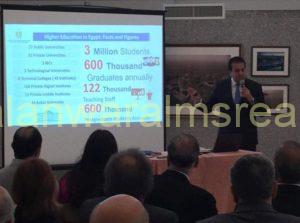· ومن جهة أخرى التقى الوزير بمقر السفارة المصرية بواشنطن، بما يزيد عن ثلاثين أستاذًا وباحثًا أمريكيًّا من أصل مصري بجامعات جورج واشنطن وجورج مايسون وميرلاند وجونز هوبكينز، وعدد من ممثلي البنك الدولي، وصندوق النقد الدولي، والمعاهد الوطنية للصحة، وهيئة الغذاء والدواء الأمريكية، والمبتعثين المصريين. وقدم الوزير عرضًا عن المنظومة التعليمية والبحثية المصرية، وما تشهده من تطوير وتحديث باستثمارات ضخمة، وأبرز الرؤى والتطلعات المستقبلية التي تسعى إلى تحقيقيها.