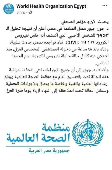 بيان منظمه الصحه العالميه عن الحاله التي تم اكتشافها في مصر مصابه بڤيروس كورونا مصر خاليه تماما من الڤيروس ولا صحه لكل ما أشاع عن وجود حالات في المدارس