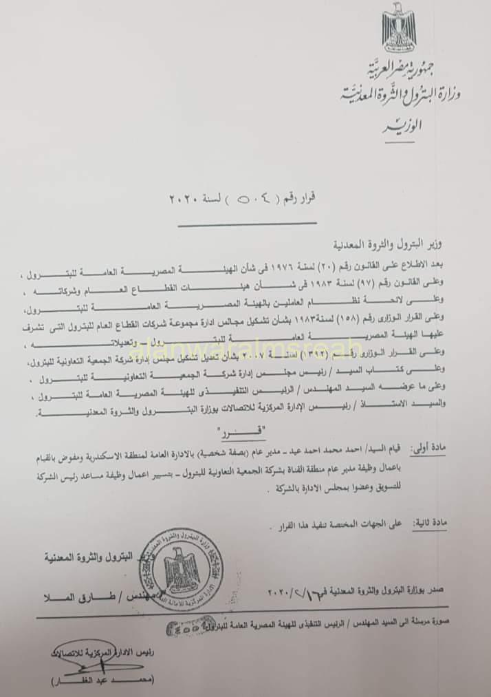 قيام المهندس/احمد محمد عيد مدير عام منطقة القناه وعضو مجلس الاداره المنتخب بتسيير أعمال مساعد رئيس الشركه للتسويق وعضو مجلس إدارة بالتعيين اعتبارآ من 2020/2/16 وعليه يتم تصعيد الاستاذ/على ابوهاشم إلى عضوية مجلس الاداره ليحل محل المهندس أحمد عيد حيث انه الثالث فئات بانتخابات يونيو 2018