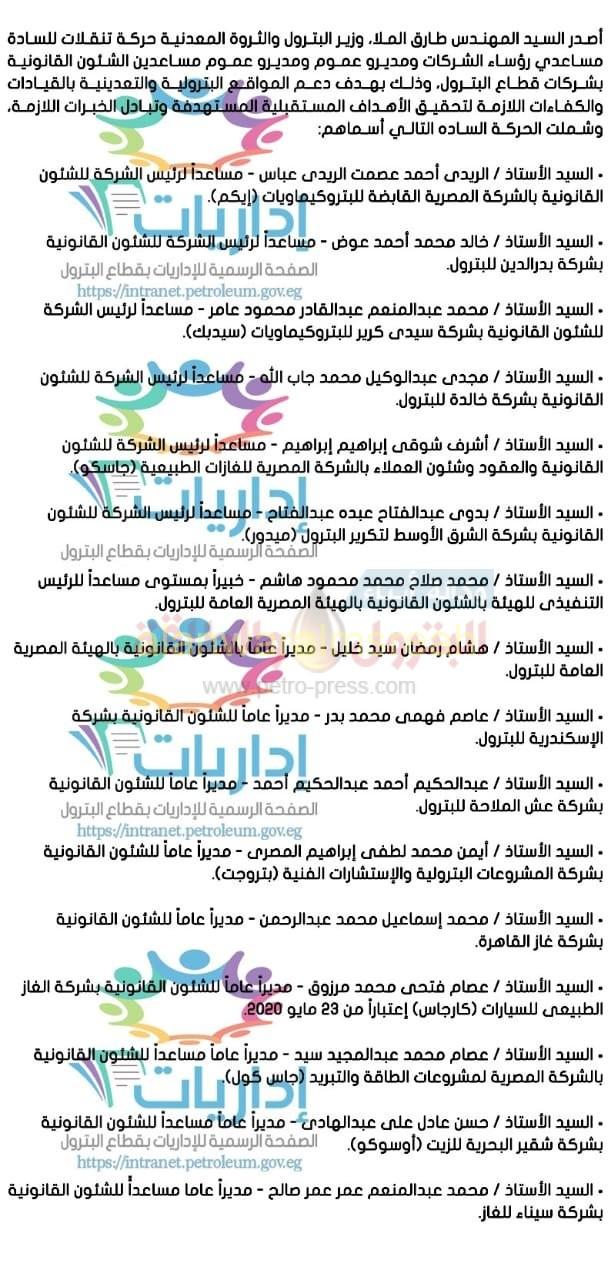 بالاسماء..وزير البترول يصدر حركة تنقلات لمساعدى رؤساء الشركات ومديرو عموم ومديرو عموم مساعدين بالشؤن القانونية