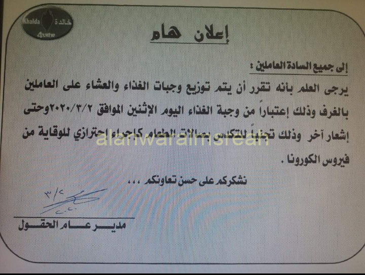 تواردت انباء عن.اصابه مهندس كندى بحقول خالده بكرونا وان وزيره الصحه قررت فرض الحجر الصحى لمده 14 يوما ومنع الاجازات