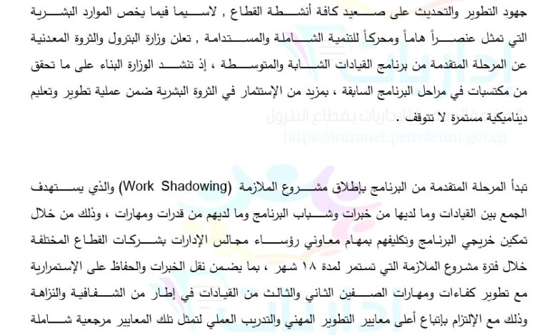 إنطلاقاً من رؤية وزارة البترول والثروة المعدنية وإيمانها الراسخ بأهمية الثروة البشرية ، واستكمالا لمسيرة تحديث قطاع البترول المصري بما يتسق مع إستراتيجية مصر ۲۰۳۰ ، وعملا على ضمان إستمرارية جهود التطوير والتحديث على صعيد كافة أنشطة القطاع, لاسيما فيما يخص الموارد البشرية التي تمثل عنصراً هاماً ومحركاً للتنمية الشاملة والمستدامة, تعلن وزارة البترول والثروة المعدنية عن المرحلة المتقدمة من برنامج القيادات الشابة والمتوسطة ، إذ تنشد الوزارة البناء على ما تحقق من مكتسبات في مراحل البرنامج السابقة ، بمزيد من الإستثمار في الثروة البشرية ضمن عملية تطوير وتعليم ديناميكية مستمرة لا تتوقف