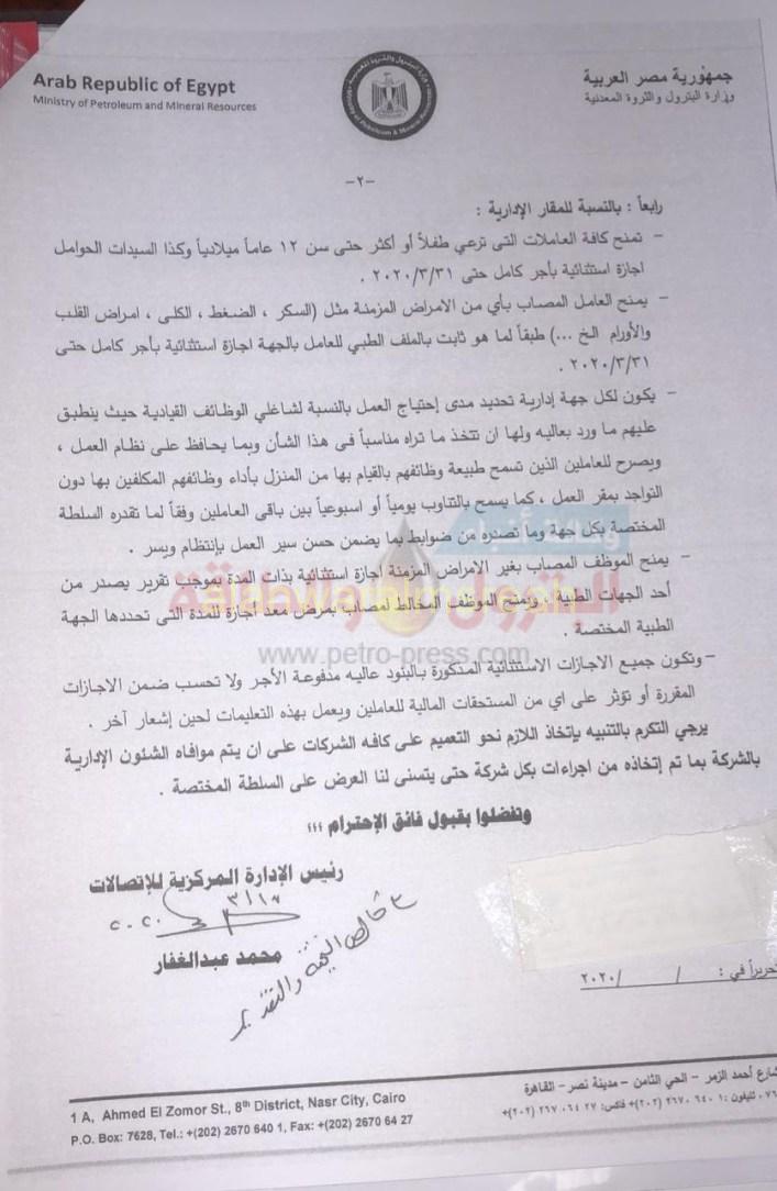عاجل..ننشر منشور وزارة البترول المرسل للشركات بضوابط العمل والاجازات بالمقرات الأدارية والمصانع والحقول