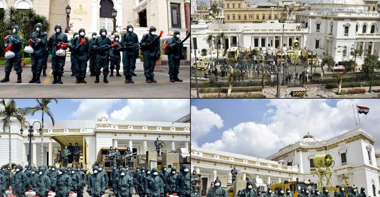 قامت القيادة العامة للقوات المسلحة بمواصلة خطتها لإتباع الإجراءات الوقائية لعدد من المنشآت الحكومية والمرافق الحيوية بالدولة من خلال تكليف إداراتها التخصصية بدفع عربات التعقيم المتحركة والتطهير الثقيلة وأطقم التطهير المحمولة لإجراء التعقيم والتطهير اللازم لمقرات مجلس النواب ومجلس الوزراء وما يتضمنوه من منشآت وقاعات للمؤتمرات وإنعقاد الجلسات بما يحقق ضمان سلامة وحماية أعضاء البرلمان المصرى والسادة الوزراء والعاملين من إحتماليات الإصابة بأى عدوى لفيروس كورونا .