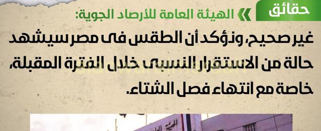 وأوضح المركز الإعلامي في تقرير توضيح الحقائق الصادر اليوم أنه تواصل مع مركز التحاليل والتنبؤات الجوية بالهيئة العامة للأرصاد الجوية، والذي نفى تلك الأنباء، مؤكدا أنه لا صحة لتعرض مصر لأي منخفضات جوية خطيرة خلال الفترة المقبلة، مشددا على أن الطقس في مصر سيشهد حالة من الاستقرار النسبي خلال الفترة المقبلة، خاصة مع انتهاء فصل الشتاء.