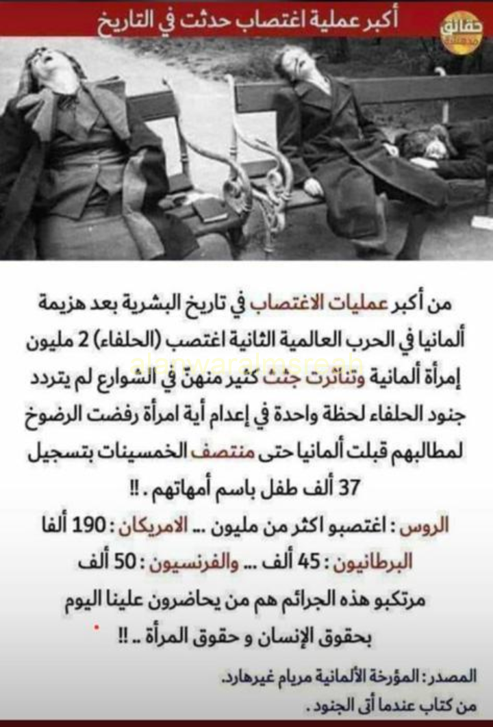 تحدثوا عن حقوق المرأه وماذا فعلوا بها اغتصبوها وبأرقام لاتقبل الشك ومن كتبهم وبأعترافتهم ننشر هذا حتى يعلم ابنائنا وابنائهم من ضرب بحقوق الانسان والمراه عرض الحائط