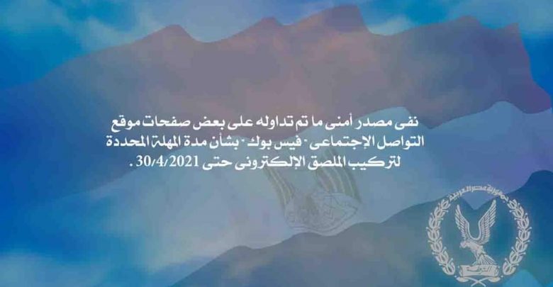 نفى مصدر أمنى ما تم تداوله على بعض صفحات موقع التواصل الإجتماعى ” فيس بوك ” بشأن مدة المهلة المحددة لتركيب الملصق الإلكترونى حتى 30/4/2021 .