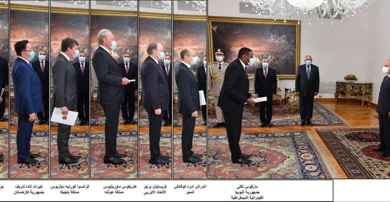 تسلم السيد الرئيس عبد الفتاح السيسي صباح اليوم أوراق اعتماد خمسة عشر سفيراً جديداً بالقاهرة”.