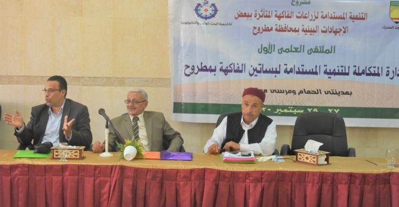 نظم مشروع التنمية المستدامة لزراعات الفاكهة المتأثرة ببعض الاجهادات البيئية بمطروح الملتقى العلمي الأول بعنوان الإدارة المتكاملة للتنمية المستدامة لبساتين الفاكهة بمطروح في إطار التعاون المشترك بين اكاديميه البحث العلمي من أجل التنمية في مصر كجهه ممولة ومركز بحوث الصحراء كهيئة علمية وبيت خبرة متخصص في كافة مجالات التنمية المتكاملة للصحاري كجهه منفذة بحضور ا.د شرين عادل عبدالحميد رئيس المشروع مركز بحوث الصحراء و ا.د محمود ابراهيم الدسوقي الباحث المناوب بمركز بحوث الصحراء والمهندس أحمد يوسف مدير عام مديرية الزراعة بمطروح