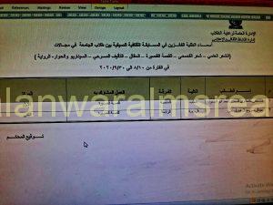 وجاء المركز الأول في مجال التأليف المسرحي للطالبة” نسمة جمال عبد المجيد رفاعي” ، وكذلك سجل الطالب “أحمد عبد الباسط معين ” المركز الأول في مجال الرواية ،بينما جاء المركز الأول في مجال المقال الصحفي من نصيب الطالب “يحيي عبده أحمد محمد ” كما سجل الطالب ” عبد الوهاب أحمد عبد الوهاب ” المركز الأول في مجال الشعر بالفصحي وكذلك المركز الأول أيضاً في مجال الشعر العامي ، وفي مجال الالقاء سجلت الطالبة “اميرة عبد الودود المركز الأول ، غير أن المركز الأول في مجال القصة القصيرة جاء من نصيب الطالب “مصطفي طنطاوي السعدي ” .