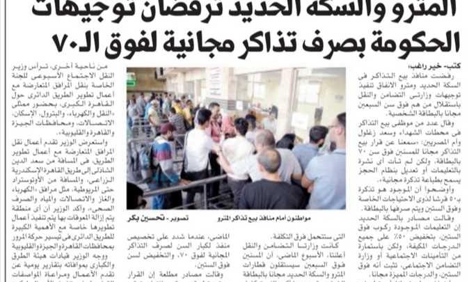 بدأت وزارة النقل صباح اليوم الأربعاء، تنفيذ تطبيق بيع التذاكر المجانية للمسنين فوق سن ال 70 عاما بالبطاقة الشخصية، تنفيذا لمبادرة الحكومة وتنسيق وزارتي التضامن الاجتماعي والنقل في تقديم الخدمات لفوق سن الـ 70، وذلك بعد ساعات من نشر شكاوى الركاب من عدم تفعيلها رغم تنفيذها في اتوبيسات النقل العام