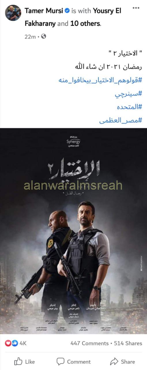 نشر المنتج تامر مرسي، البوستر الدعائي الأول لمسلسل “الاختيار٢”، وظهر الفنان كريم عبدالعزيز والفنان أحمد مكي يتصدران البوستر، وعلق المنتج تامر مرسي عبر صفحته الشخصية بموقع الفيسبوك حيث كتب: “الاختيار ٢، رمضان ٢٠٢١ إن شاء الله، قولولهم الاختيار بيخافوا منه، سينرجي، المتحدة، مصر العظمى”.