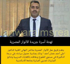 فريق عمل الأنوار المصرية يهنىء الدكتور “علي أحمد عثمان ” لحصوله علي الدكتوراة بجامعة الاسكندرية
