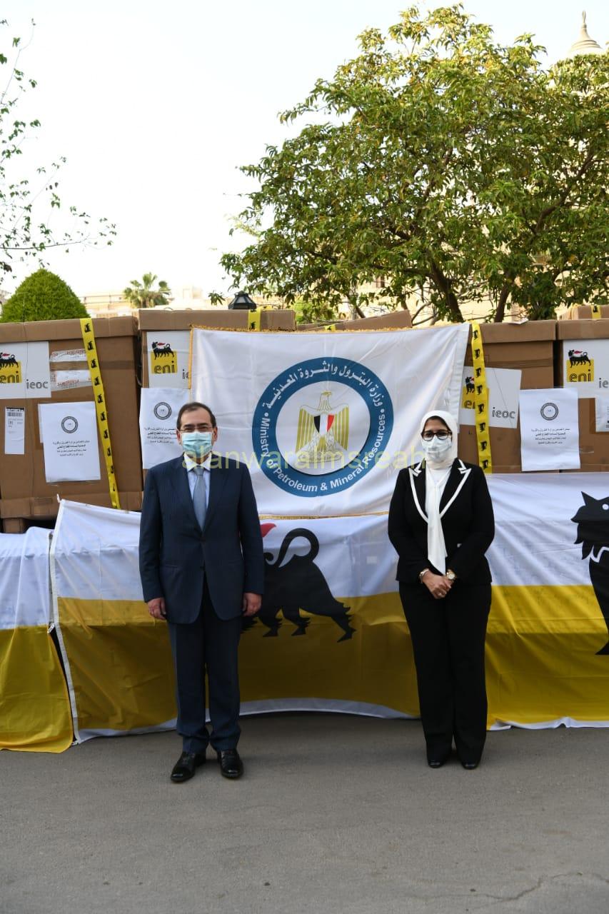شهد المهندس طارق الملا وزير البترول والثروة المعدنية والدكتورة هالة زايد وزيرة الصحة والسكان بمقر وزارة الصحة وقائع تسليم 20 جهاز تنفس صناعى بتكلفة تتخطى 600 ألف دولار مقدمة من شركة إينى الإيطالية