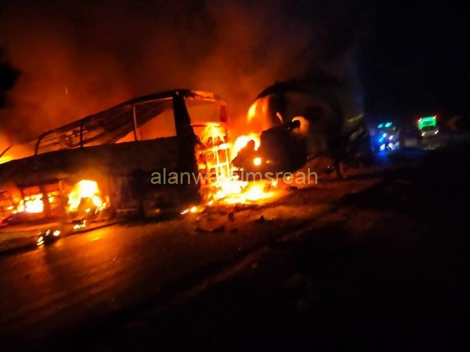 عاجل بالصور.. مصرع 12 وإصابة 4 نتيجة حادث تفحم اتوبيس على الطريق الصحراوي الشرقي