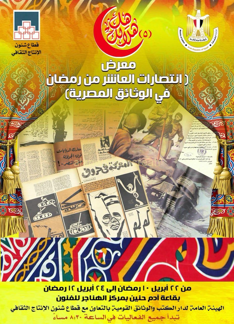 كما يتضمن برنامج الاحتفال افتتاح معرض ” انتصارات العاشر من رمضان فى الوثائق المصرية” الذى تنظمه الهيئة العامة لدار الكتب والوثائق القومية برئاسة الدكتورة نيفين محمد موسى، بالتعاون مع القطاع، وذلك بقاعة آدم حنين بمركز الهناجر للفنون، تحت إشراف شادى سرور مدير عام مركز الهناجر للفنون، ويستمر المعرض حتى ٢٤ أبريل الجارى.
