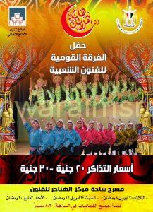 حيث تعرض فرق البيت الفنى للفنون الشعبية والاستعراضية برئاسة المخرج عادل عبده، باقة من أشهر الاستعراضات الفنية للفرقة القومية للفنون الشعبية برئاسة المخرج هانى النابلسى، إلى جانب مجموعة متنوعة ومتميزة من فقرات السيرك القومى برئاسة الفنان وليد طه .