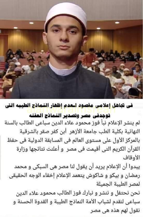 وصلتنا هذة الرسالة من بعض الاصدقاء من خلال الواتس واحببت انشرها لان فوز الطالب علاء السباعى بالمركز الاول فى المسابقة الدولية لحفظ القرآن شئ يشرفنا كمصريين.