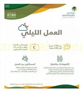 أصدر وزير العمل والتنمية الاجتماعية في السعودية، المهندس أحمد الراجحي، قراراً وزارياً يتعلق بتنظيم العمل الليلي، ويوضح ما على العامل الليلي من واجبات وما له من حقوق لدى المنشآت التي يعمل لديها، حيث جاء في تفاصيل القرار إيضاح بأن المقصود من العمل الليلي هو كل عمل يؤدى خلال الفترة من الساعة الحادية عشرة مساءً وحتى الساعة السادسة صباحاً، أما ساعات العمل المعتادة فهي تشمل كل عمل يؤدى خلال الفترة من الساعة السادسة صباحاً حتى الساعة الحادية عشرة مساءً، وتُعد هذه الفترة هي الأصل في ساعات العمل.
