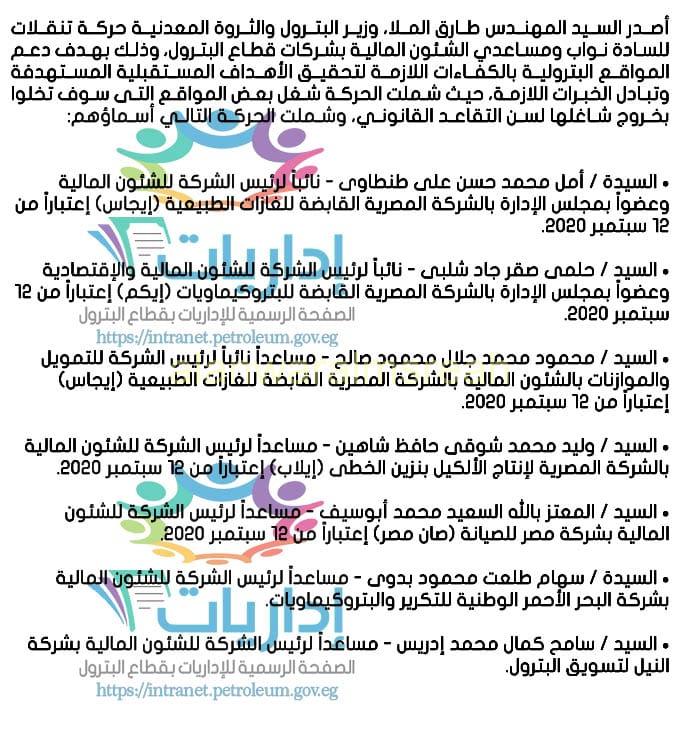اصدر المهندس طارق الملا وزير البترول والثروة المعدنية حركه تنقلات بين قيادات الشئون المالية بشركات البترول وتضمنت