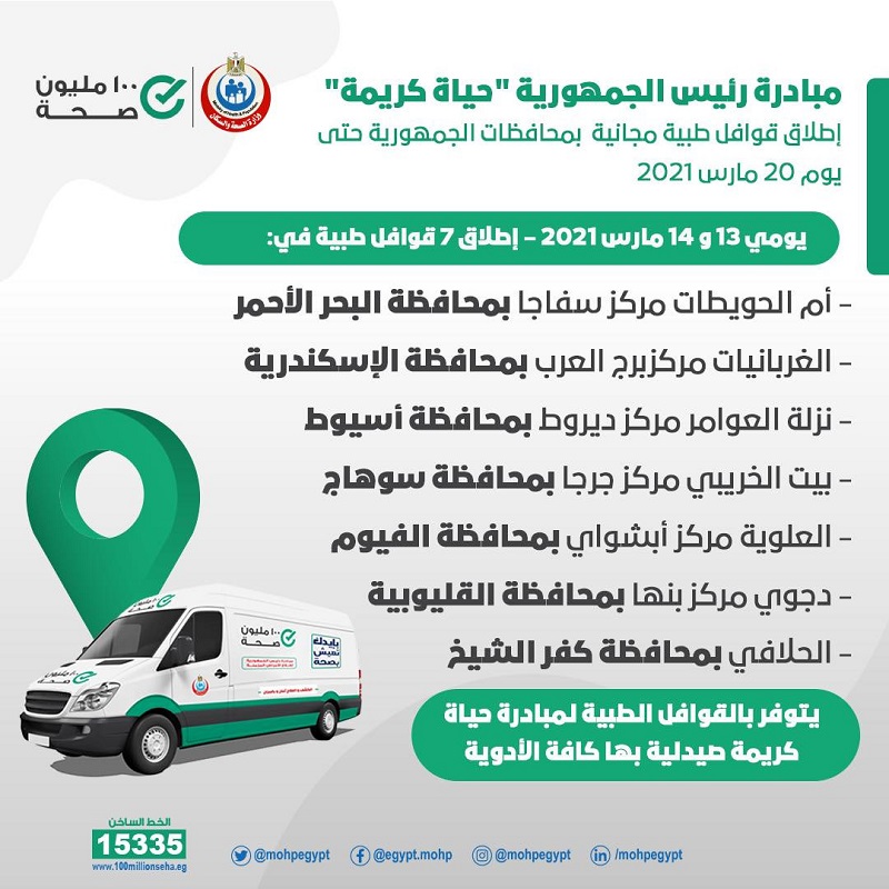 الصحة تطلق قوافل طبية فى 7 محافظات ضمن المبادرة الرئاسية حياة كريمة