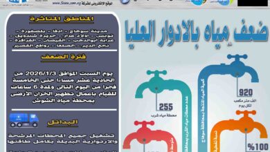 السبت: ضعف المياه بالادوار العليا بمدينة و قرى مركزسوهاج الحادية عشرمساءا ولمدة 6 ساعات للقيام بأعمال تطهير الخزان الأرضى بمحطة مياه الشوش
